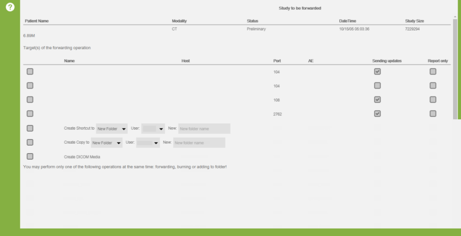 Forwarding studies queues the images, reports, annotations and overlays associated with a study to one or more selected DICOM destinations. Forwarding data to another DICOM device requires Forward/Export rights.