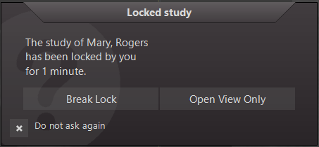 The notification can be suppressed in future cases by clicking on Do not ask again. The setting applies to studies locked by the person opening the study. For example, when you have the study open for editing on a workstation you walked away from before saving your work. Restore the notification from the Frame/Warnings/Own lock break message mode setting in the Tools/Options panel.