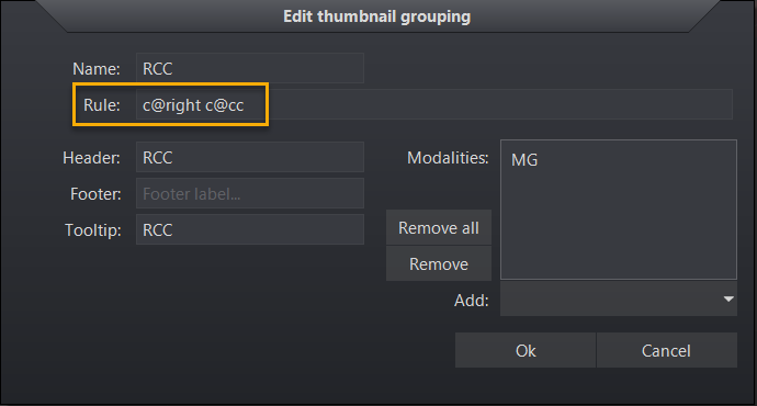 EXAMPLE: Below is a factory default grouping rule for a RCC mammography view.  Notice the rule uses augmented arguments for laterality (c@right) and view position (c@cc).  Using augmented arguments like this allows the rule to have a higher rate of success by not solely depending on a specific series description as vendors differentiate from one another.  If series description was included the rule would look like this: "rcc c@right c@cc"