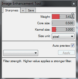A képjavító eszköztár hozzáférést biztosít a képélesítő, simító és élészlelő eszközökhöz, az előre beállított javító beállításokhoz és a képjavító vezérlőpanelhez. A kapott képek képkockákban jelennek meg, így más eszközök, például nagyítás, ablakolás, annotációk stb. számára is.