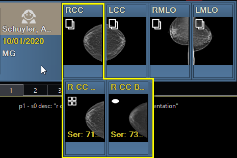 The result of this grouping rule can be seen below.  Notice the series descriptions of the two series are different.  However, because the rule is using the more consistent laterality and view position augmentation argument, the viewer successfully groups the two RCC series.