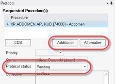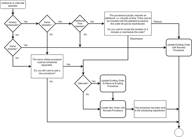 Radiologists performing a protocol review may update the order by selecting additional procedures or specifying alternate procedures. When the existing procedures are not scheduled, these changes have minimal impact. However, when a procedure has already been scheduled, or the procedure is for a different modality, the workflow can vary depending on the change.