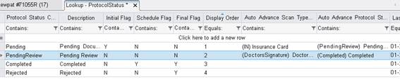 In the following example, the first auto advance rule (on the first row) will automatically advance the protocol status from Pending to Pending Review when a scan type of Insurance Card is attached to the order. The exam would then appear on the radiologist's worklist, allowing them to open the Protocol Review screen and move the exam directly to Completed or Rejected.