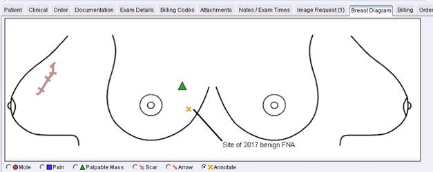 The existing Breast Drawing Tool provides the technologist with a quick and effective way to communicate to the radiologist the area of the breast where certain abnormalities or symptoms are located. Visually representing this information decreases the risk of misinterpretation and allows the radiologist to process the information much more efficiently than reading a typed description and visualizing it in their mind.