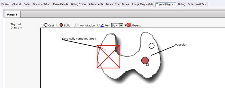 The screenshot below shows an example of a simple Thyroid image that has been annotated by the technologist.