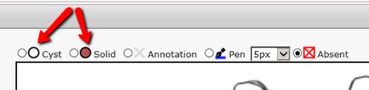 The legend used to select the tools for annotating has been moved above the background image because the custom images will vary in size. All of the tools that are available in the standalone Breast Drawing Tool will be available within the Digital Form, along with some new options.