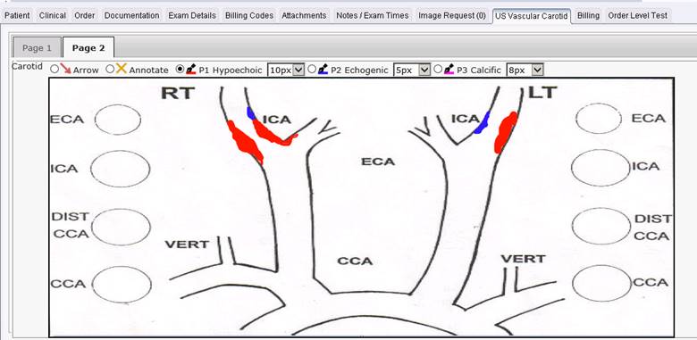 In addition, some new tools have been added. In the Carotid example below, different color Pen tools are available, with the various colors representing different types of plaque. A default pen thickness can be selected when creating the Digital Form, but users can make adjustments as needed.