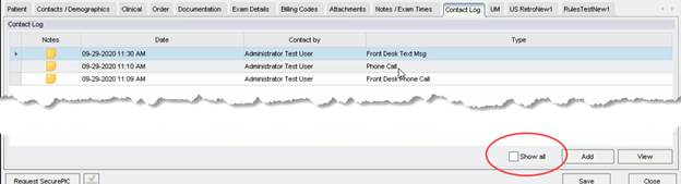 When configured, the Contact Log tab for a patient will now be filtered by default to display only those contact types configured for the screen. Checking the Show all checkbox on the screen allows viewing of all contact activity for the patient.