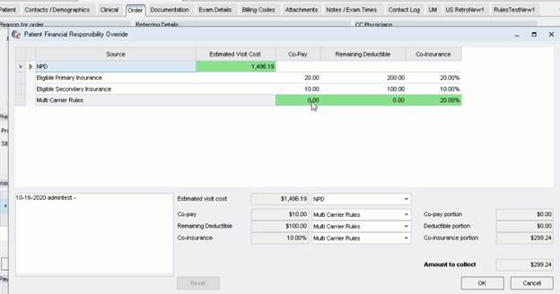 In the following Patient Financial Responsibility Override dialog, note the Amount to Collect Details and how the "Multi Carrier Rules" source is selected when there are multiple carriers:
