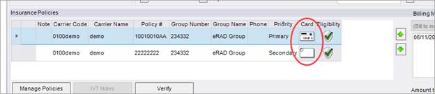 The new icons are also presented in the Manage Insurance Policies window if the Insurance policy is associated with insurance card attachment or if attachments are available to review.